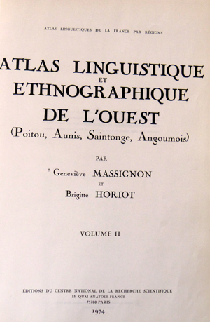 Dans cet « Atlas linguistique et ethnographique de l’Ouest » (Poitou, Aunis, Saintonge, Angoumois) deux chercheurs du Centre national de la recherche scientifique (CNRS), Geneviève Massignon et Brigitte Horiot ont ainsi collecté en tout, dans les années soixante, 615 termes ou locutions, déclinés jusqu’à 124 fois dans une carte pour certains.