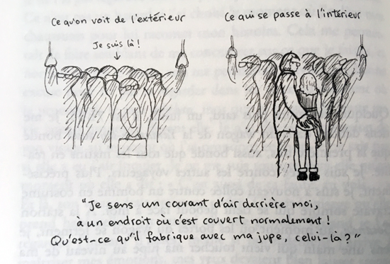 « Tchikan » est raconté très simplement. Le texte s’aère de temps à autre de dessins explicatifs qui pourraient être jolis s’ils ne dénonçaient une réalité quand même insupportable. Kumi Sasaki raconte que les prédateurs dont elle a été la victime sont tous les mêmes. Que l’environnement des transports bondés favorise les attouchements subreptices, souvent beaucoup plus appuyés.