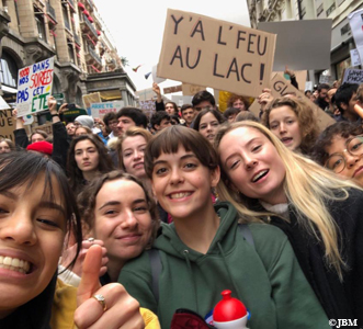 En réponse au présentateur évoquant les gilets jaunes, le héros de la Nouvelle Vague, âgé de quatre-vingt-neuf ans, a déclaré songer à « un film qui raconte l’état de ce pays, la France, ou certains aspects de ce pays ». Et apparemment les gilets jaunes français, et non pas les gilets jaunes suisses (image ci-dessus) qui ont manifesté devant le siège de l’ONU en février dernier. Ou encore les étudiants suisses multinationaux, dont ma petite nièce rolloise Jillian, émule de Greta, ayant séché le « gymnase » de Morge, le 15 mars dernier, pour aller brandir à Genève un panneau proclamant « y’a l’feu au lac » !