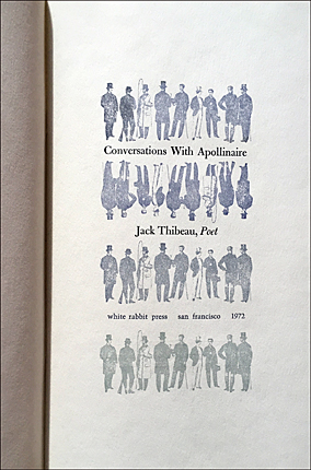 La traduction de la langue américaine, surtout venue de la poésie, n’est pas forcément chose aisée. Mais cela donne, de façon non littérale, à-peu-près ça: « Apollinaire est dans un endroit que nous ne pouvons pas voir et il nous regarde à travers des lunettes de haute puissance. Nous passons un appel téléphonique longue distance à Apollinaire mais Apollinaire ne répond pas. Apollinaire reste là, à écouter la sonnerie du téléphone, à nous regarder à travers des lunettes de haute puissance, à écouter la sonnerie du téléphone. C’est un peu les rideaux de la fin pour Apollinaire. Et des rideaux si hauts que l’on n’en voit que le bas. Apollinaire est dans le désert avec les rideaux tirés à minuit. Ces rideaux se trouvent être des rideaux violets. Apollinaire se déplace dans le désert comme un cadran solaire géant. Apollinaire est à trois heures et va vers trois heures et demie. Apollinaire est un lézard qui fait des chèques sans provision. » Ce bien original et déroutant poème, intitulé « Apollinaire in Nevada », est extrait de « Conversations with Apollinaire », un recueil publié en 1972 sous le nom de Jack Thibeau.