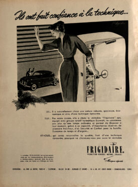 La description de la soirée est un régal de connaisseuse, puisqu’un « tricot aux doigts, Madame se délasse enfin dans un fauteuil revêtu de tissu Cordoual ». Quant à Monsieur, « il lit « , une bonne pipe de bruyère au bec, entouré de petits objets de vannerie des ateliers Sallier. Vient ensuite le « moment du sommeil » et de rien d’autre, car nous sommes en 1952. Un encart le dit d’ailleurs sans ambages: si la femme est « amoureuse », elle l’est surtout de sa machine multi-tâches Balex, capable de cirer, dépoussiérer, décaper et pulvériser Dieu sait quoi encore.