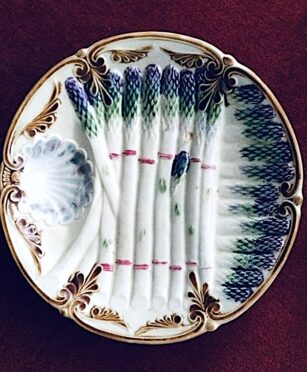 Quelles que soient les préférences de celui qui s’apprête à les déguster, ces turions demandent la plus grande attention pour leur cueillette, exclusivement manuelle, ainsi que pour leur conservation et leur préparation. Leur fragilité et la spécificité de leur saveur justifient qu’on les traite avec respect et délicatesse… mais aussi qu’on soigne particulièrement la présentation. De la même façon « qu’un beau cadre ajoute à la peinture », l’asperge mérite un habillage raffiné. C’est ce qu’avaient compris nos arrière-grands-parents qui, à la fin du XIXe siècle et au début du XXe, se passionnèrent pour des assiettes très décoratives exclusivement fabriquées pour servir ce mets raffiné. Ces assiettes aujourd’hui recherchées par les collectionneurs après avoir connu l’inévitable désamour pour cause de « kitsch », portent le joli nom de « barbotines ». Un mot typiquement français, les autres pays parlant plutôt de « majoliques ».