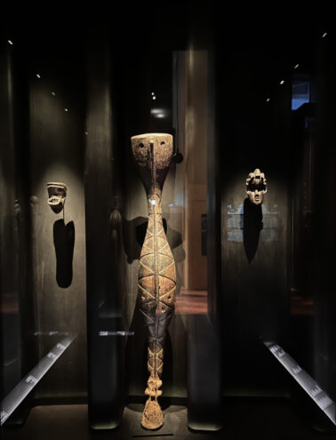 Une telle déclaration nous change un peu de ce que l’on peut entendre devant différents micros ou bien lire sur les réseaux sociaux en ce moment-même. Et chaque pas effectué à l’intérieur de cet établissement -un peu trop sombre- nous conforte dans l’idée qu’effectivement, d’autres civilisations valent bien la nôtre. Certes le tambour à fente peut sembler extravagant mais il a quand même plus de gueule que nos parcmètres. D’un côté il y a une inspiration, de l’autre une mentalité rébarbative de taxation. À propos de finance d’ailleurs, du côté de la Nouvelle Irlande (Papouasie) ils avaient élaboré un masque terrifiant, de façon à mieux convaincre les donateurs lors des opérations de collecte, afin de couvrir les frais de funérailles. Il nous est dit que c’était fait sur le ton de la plaisanterie mais quand on voit le masque, l’envie d’obtempérer se manifeste très naturellement, même pour le simple visiteur du musée. Les inspecteurs des contributions devraient se renseigner, cela ferait du bien aux caisses de l’État dont personne n’a encore réparé le fond percé. Tout cela fait partie des collections permanentes dont au passage, quelques artefacts de la culture Sepik (1), celle qui intéressait Apollinaire.